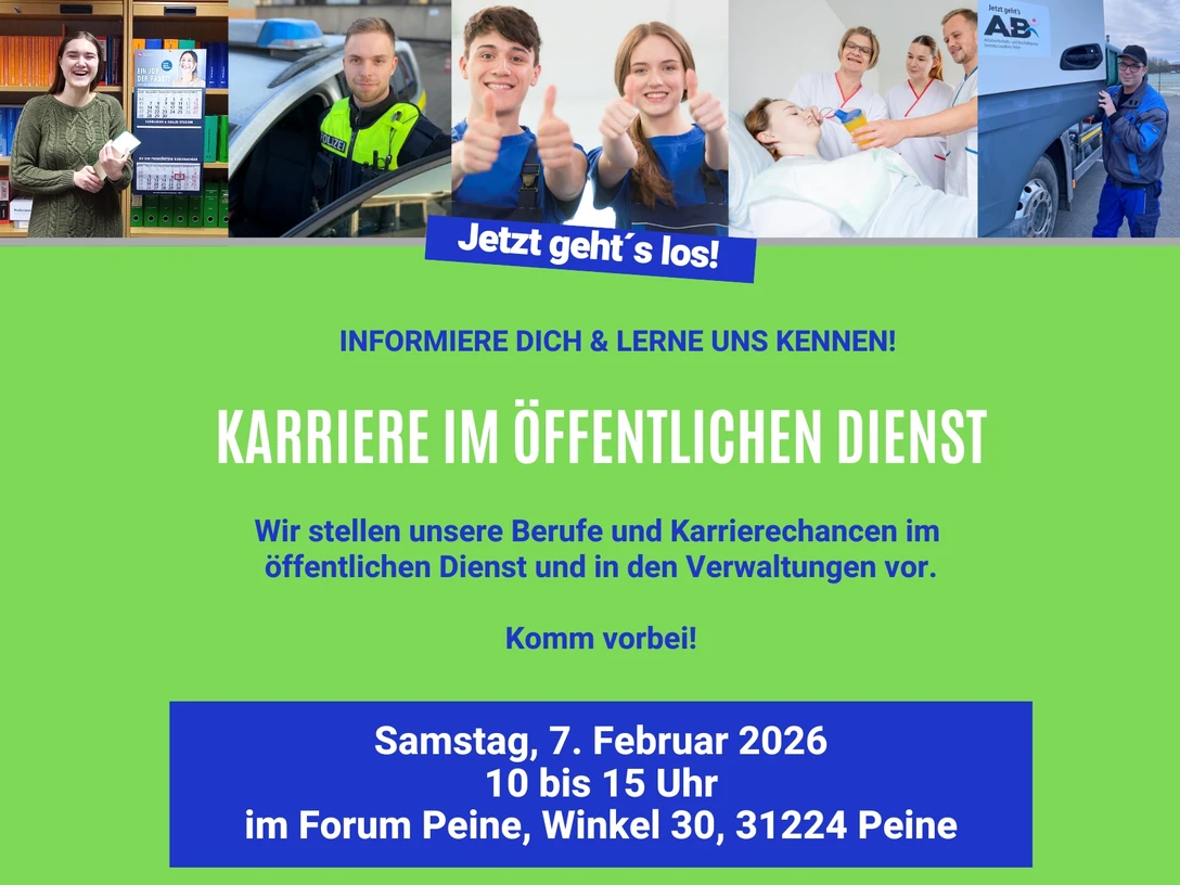 Auf der "Karriere im Öffentlichen Dienst" am Samstag, den 7. Februar 2026 von 10 bis 15 Uhr im Forum Peine möchten wir unsere Jobs vorstellen und Stellensuchenden, sowie Personalverantwortliche zusammenbringen.